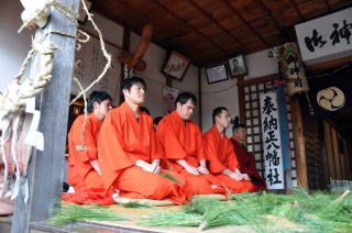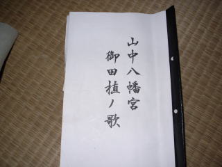 厄男達全員が拝殿に戻り、神職祝詞、役員及び厄男達の千秋 万歳楽そして田植え謡を謡うという。 歴史上、田植え謡は12句 あったが、現在は4句が伝わるという。 謡は他人に知られられ ないように声を低く籠らせるため、詳細は不明であった。 田植え謡 が、終わるたびに、鳥居前の門松の葉が投げ込まれる。 (早苗打ち=田植え作業を表すという) |